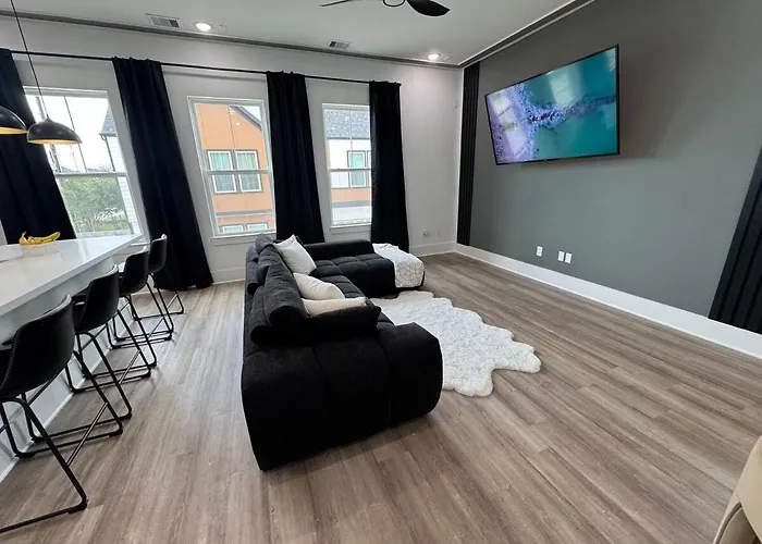 Welcome to the Stylish Ultra-Modern Home, a contemporary sanctuary nestled in the vibrant heart of Houston, just 18 km from the Ensemble/HCC district. This sleek accommodation captures the essence of urban sophistication, featuring expansive floor-to-ceiling windows that illuminate the open-concept living spaces with natural light. A harmonious blend of comfort and style, the property boasts state-of-the-art amenities, ensuring every guest enjoys an unparalleled stay.